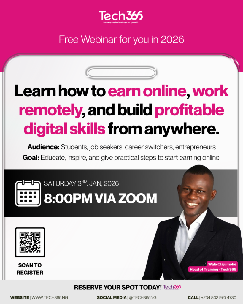 Date: January 3rd 2026. Time: 8pm - 9pm (WAT) This 1-hour webinar will give you How to earn online High-paying tech and digital skills Remote work options Fill out the form below to register First Name *Last Name *Email Address *Phone Number *LocationCurrent Status *Looking for a jobStudentWorking FulltimeChanging CareerSelf Development / Further StudyFreelance / Self-employedUnemployed but not searchingPreferred mode of communicationWhatsAppEmailCall Submit